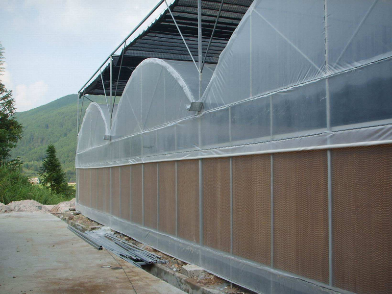 該系統(tǒng)具有降溫效果好、操作簡(jiǎn)單等特點(diǎn),通過(guò)濕潤(rùn)凈化的空氣更有利于室內(nèi)作物的生長(zhǎng),若配合遮陽(yáng)系統(tǒng)綜合使用,降溫效果更為顯著??紤]冬季溫室的保溫,應(yīng)在濕簾墻外側(cè)加裝一層保護(hù)膜或齒條外翻保護(hù)窗。