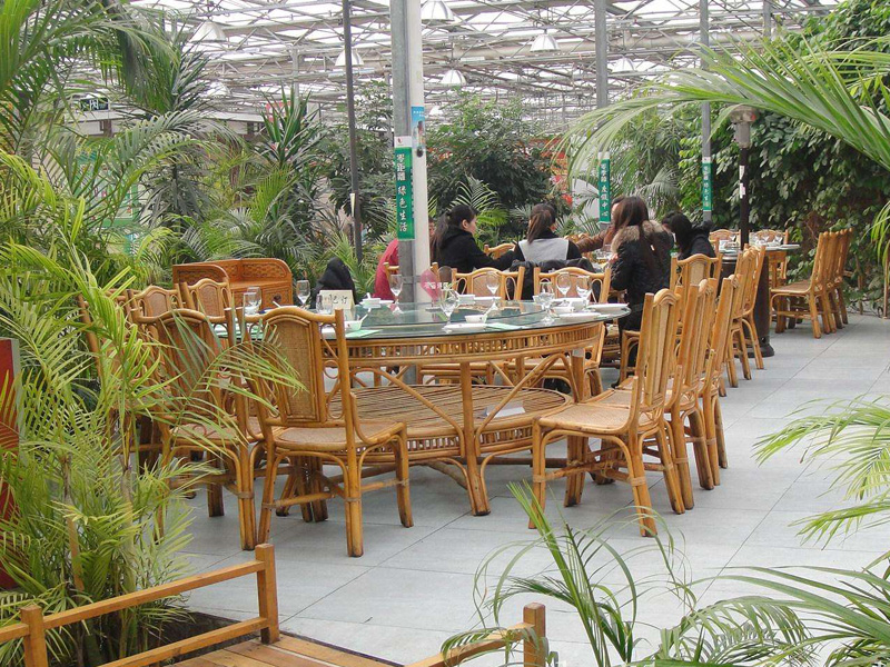 生態(tài)溫室綜合運(yùn)用建筑學(xué)、園林學(xué)、設(shè)施園藝學(xué)、生態(tài)學(xué)等相關(guān)學(xué)科知識(shí)進(jìn)行規(guī)劃、設(shè)計(jì)和建設(shè),以設(shè)施調(diào)控技術(shù)、農(nóng)藝栽培及管理技術(shù)來(lái)維護(hù)餐廳的優(yōu)美環(huán)境,形成以綠色景觀植物為主,蔬、果、花、草、藥為輔的植物配置格局,結(jié)合假山、瀑布、小橋流水、竹木亭閣等園林景觀,全方位立體展現(xiàn)綠色、優(yōu)美、宜人的就餐環(huán)境。